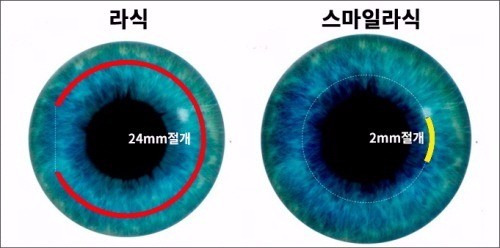 기존 라식이 각막 절편을 크게 절개해 시력을 교정했다면, 스마일라식은 2~4mm 정도의 미세 절개만으로 시력교정이 가능해 통증과 회복 부담이 훨씬 적습니다.